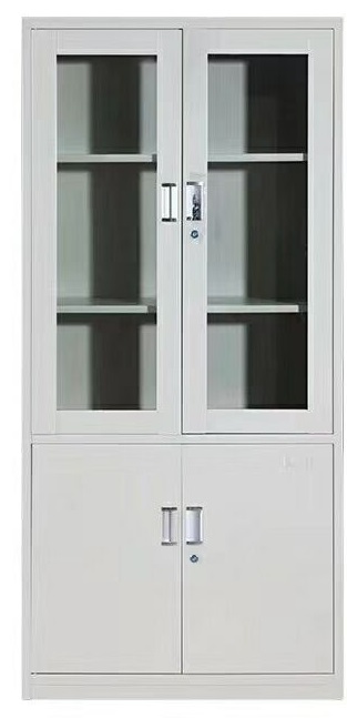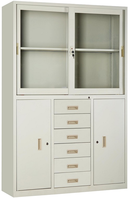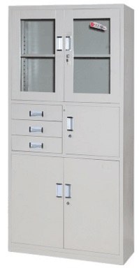 此柜選用0.8mm厚優(yōu)質(zhì)冷扎鋼制作,上層門為玻璃推拉門,門內(nèi)帶一塊活動隔板,每門外帶鋁合金拉手,帶鎖;下層為中間帶六個抽屜,每個抽屜帶鋁合金拉手,兩側(cè)為單門柜,門帶鋁合金拉手,帶鎖。所有金屬作脫脂、除銹、酸洗、磷化、干燥等12道防銹工序處理后高溫靜電噴涂。無氣泡、無裂縫、表面光潔、靜電噴塑、烘干處理、高溫固化,表面無脫色現(xiàn)象,要求光滑無毛刺。使其牢固耐用,美觀大方!